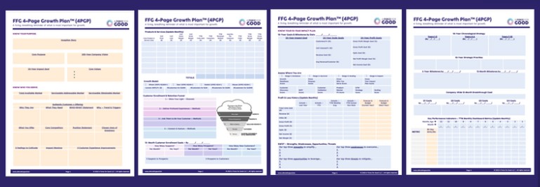 In four pages is everything you need to know to unlock the puzzle of growth in your business. All Core Growth Elements of the Force for Good Flywheel live on the 4-Page Growth Plan™. In one document, you will defi ne and iterate the essential information needed to foster growth.