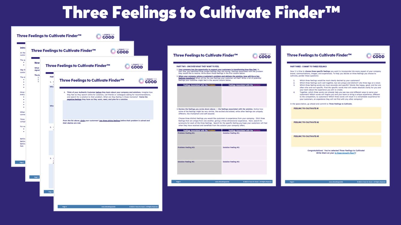 In this masterclass, you’ll use the 🍀Three Feelings to Cultivate Finder™🍀—a powerful clarity tool from the Force for Good System™—to define the 3 core emotions your brand is here to evoke at every stage of your customer journey.